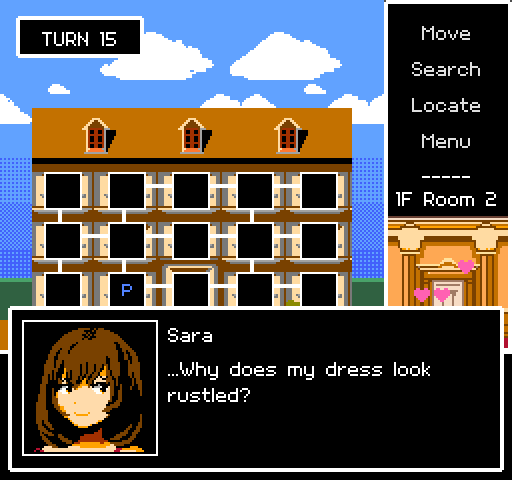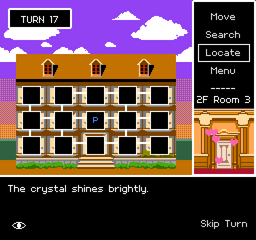 Nice game idea with a lovingly pixelated art style! The toggle for the window view of the mansion is a fun touch, maybe it could show character silhouettes for the searchers and a hint for what Sara's doing after she's been found? Since the game is all about who finds her first, it may benefit from some way to control your opponent's actions. Maybe there could be some bonus items to find or room interactions that change the map in some way to alter what the others are doing?